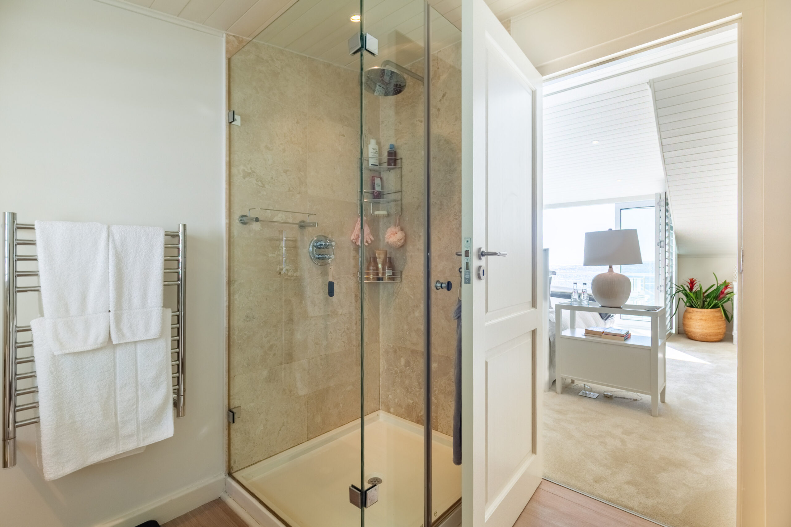 The stylish open-plan living and dining area boasts sweeping sea views, a comfortable lounge with TV, and a six-seater dining table. The fully equipped kitchen offers everything you need for a relaxed stay.
