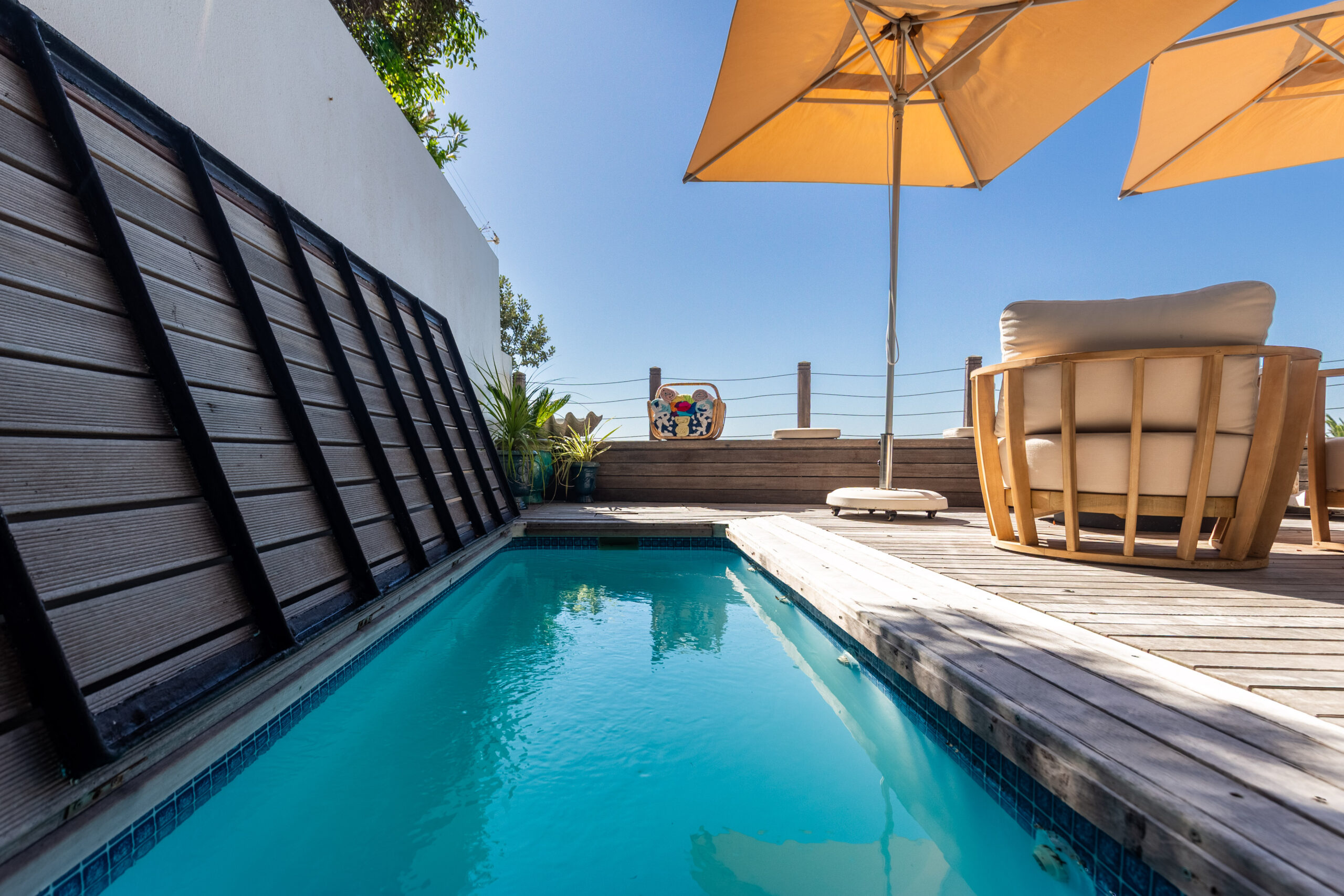Soak up the sun from the expansive private deck, complete with a swimming pool, comfortable loungers, and large umbrellas for shaded relaxation.